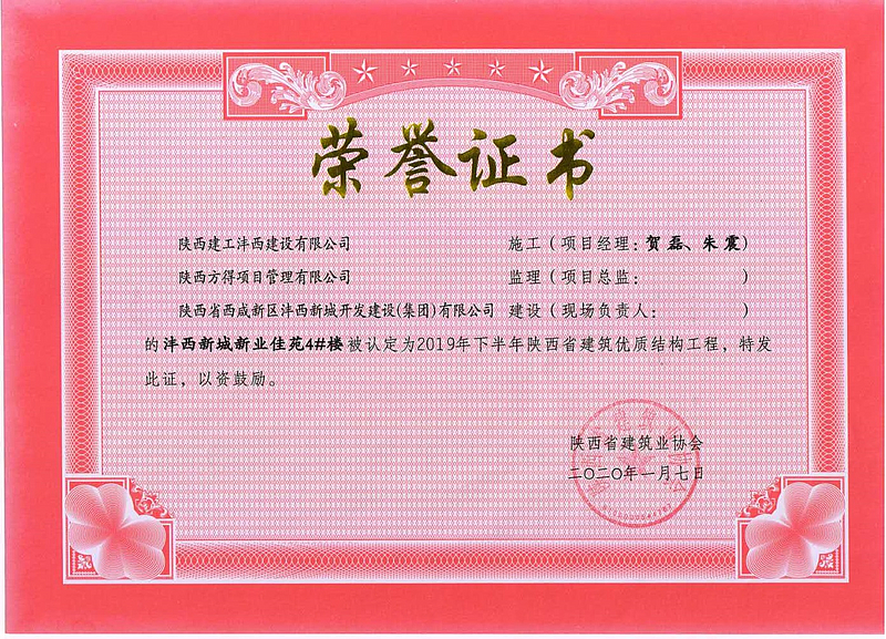 新業(yè)佳苑4#樓榮獲陜西省建筑優(yōu)質(zhì)結(jié)構(gòu)工程