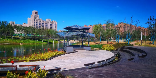 綠楔穿過五條交叉道路,被分割為六個(gè)地塊,并設(shè)五座景觀廊橋連接湖系兩岸,駁岸內(nèi)園路采用再生骨料鋪設(shè)的環(huán)保生態(tài)步行道把各個(gè)景觀節(jié)點(diǎn)串聯(lián)起來,匯聚成自然連接的統(tǒng)一體,為師生提供四通八達(dá)的路網(wǎng)系統(tǒng)。項(xiàng)目建有管理用房、田徑運(yùn)動(dòng)場、籃球場、足球場、網(wǎng)球場等多處運(yùn)動(dòng)健康設(shè)施。設(shè)置的放映廳、兒童樂園、荷影廳等功能性景觀節(jié)點(diǎn),滿足師生運(yùn)動(dòng)、休閑、觀賞、晨讀、生活需要。占有7000平方米的中心湖系,增加了校園的寧靜和師生心情上的愉悅,與周圍學(xué)校建筑樓群相得益彰。