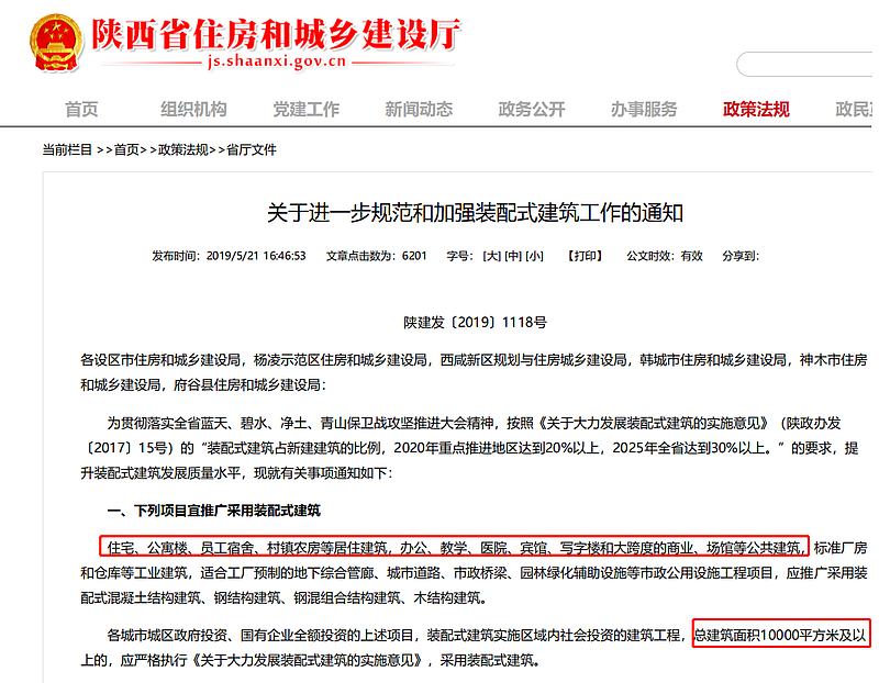 2019年5月21日,陜西省住房和城鄉(xiāng)建設(shè)廳發(fā)布《關(guān)于進(jìn)一步規(guī)范和加強(qiáng)裝配式建筑工作的通知》,進(jìn)一步規(guī)范了陜西省裝配式建筑工作的方方面面。